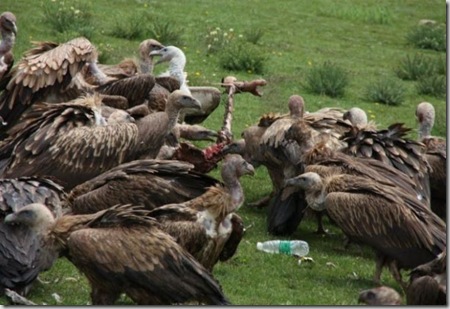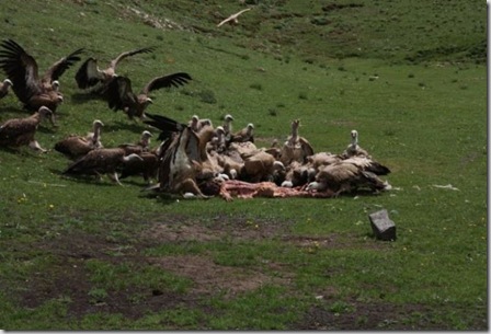 Ma il funerale più diffuso è il cosiddetto «celeste». Seguendo questo rituale il corpo del defunto viene portato su una motagna alta, dove con delle pietre gli vengono frantumate le ossa e la massa muscolare. Dopo di che entrano in gioco gli avvoltoi e le aquile dividendosi i resti.